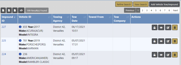 With proper permissions, you can view, edit, delete Tow/Impound records, release holds, or release vehicles using the icons that appear under the Actions column. Only the icons to which you have access appear. If you do not have permissions to perform any of these tasks, refer to your agency administrator.