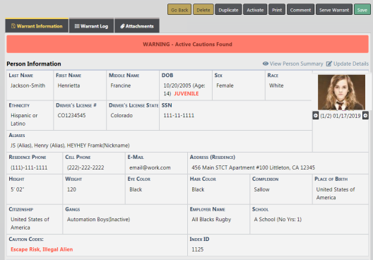 to open the Edit Person page. An Active Warrants Found message appears in red on the Person Details screen.
