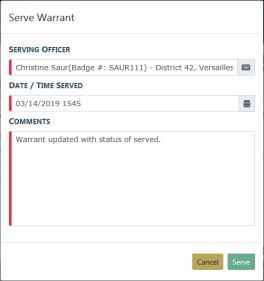 Enter the Serving Officer. The Date Served fields default to the current date and time and the Comments field defaults to Warrant updated with status of served. You can change these values as needed.