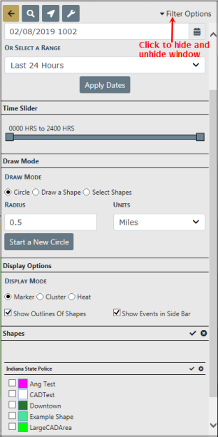 Hide or Unhide Filter Window - To hide or unhide the Filter Window, select the Filter Options button.