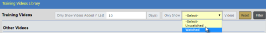 Across the top of the Training Video Library, you have the option to filter the video list by only showing videos that have been added within a specified number of days, and only show watched or unwatched videos.