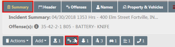 Information in the Summary tab is divided into sections, such as Officers, Employees, Offenders, Victims, Narratives, etc.