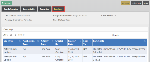 | – | The system automatically logs when the case is viewed or updated. The log captures the user's name, agency, and the date it occurred. The Access Log tab displays those log entries in a read-only format. |