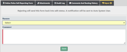 | 2. | Select a Reason for the rejection and enter a Comment. |