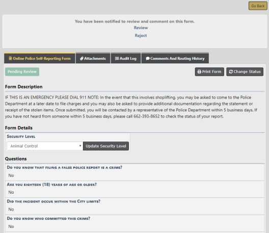 Follow these steps when the submission involves an event that does not require a police report. You do, however, want to show the Custom Form was Reviewed and Accepted by your agency.