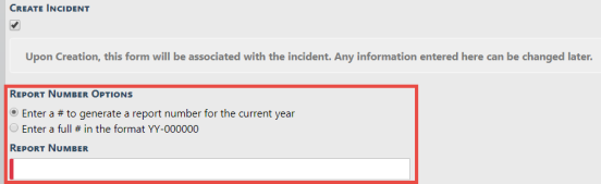 | 7. | When you create an incident, depending on the configuration by your agency, the Report Number will either be Auto Generated or require manual entry of a Case Number requested and obtained from a CAD system, respectively as shown below. |