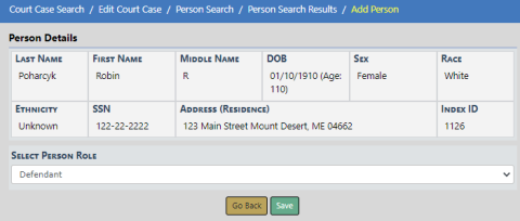 Note: If the person you want to add to the Court Case does not exist in your search, with appropriate permissions you can add the master person to Online RMS, then add that person to the Court Case.