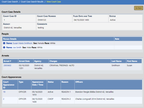 | 4. | Optionally, click on the person name, Arrest ID, Court Appearance ID, etc., to view details. |