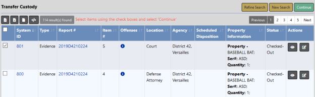 If you wish, you can also add additional evidence or held property to the Transfer Custody list by clicking on the Add Evidence/Held Property button on the top right of the screen to open the Evidence - Held Property Search Transfer Custody screen. Follow the same process as above to search and select the evidence or held propertyyou want to add, then click the Continue button. The additional records are then added to the Transfer Custody list.
