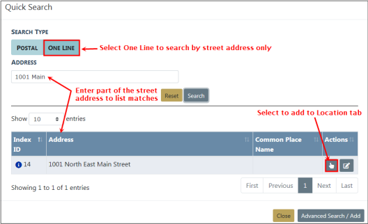 Note: If the Location you are looking for does not exist, click the Advanced Search/Add button to add it to the Master Address Index. For more information on adding a Master Address index record, refer to Master Indices.