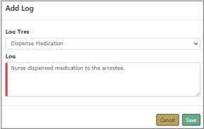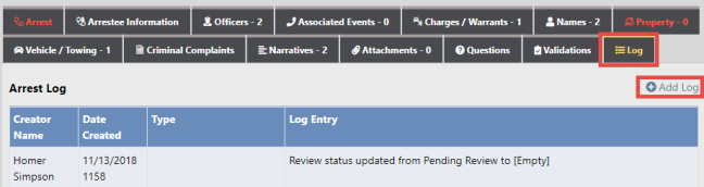 Activities affecting the Field Arrest are written systematically to the Log tab, creating a trail of events. For example, the system generates a Log entry when the Field Arrest is created, is updated, and another when it is submitted for approval. The Log entry includes the user name, date, and general description of the event.