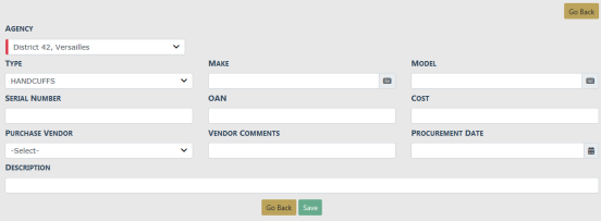 4. Click Save to create the Equipment record, or click Go Back to return to the Fleet Equipment Search screen without creating the record.