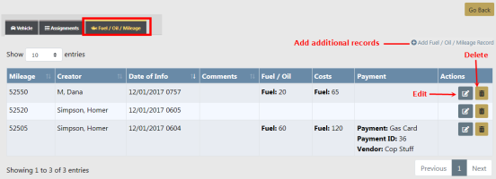 | 4. | The record appears under the Fuel/Oil/Mileage Tab of the Edit Fleet Vehicle screen. |