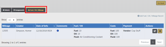 | 3. | The record appears under the Fuel/Oil/Mileage tab of the Edit Fleet Vehicle screen. |