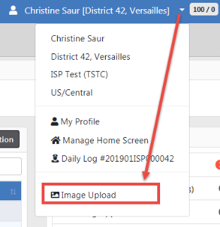 1. Click the down arrow next to your user name on the top right of the window, then click Image Upload.
