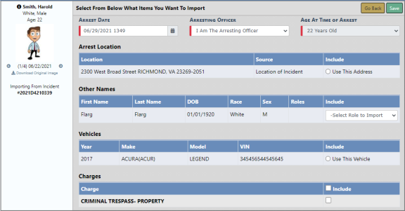 | 2. | The Import and Create Field Arrest screen appears, prepopulated with the Incident data that can import into the arrest. |