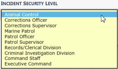 Incident Security uses a hierarchical design. A user account is assigned incident security based on general rights to view the details of an incident report. Animal Control is the lowest incident security level and Executive Command is the highest incident security level.