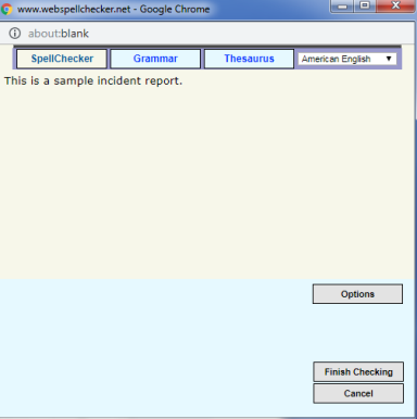 The Media/Crime Summary is designed to enter a brief description of the Incident. After entering a description, optionally select Check Spelling to open the WebSpellChecker window. When finished checking your entered text, select Finish Checking.
