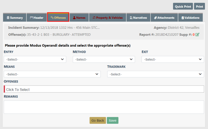 Upon completing the three sections of the Header Tab you are then taken to the Offenses Tab, where you enter any applicable offenses for the incident report.