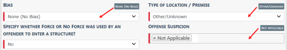 Select the appropriate answers about the offense by using the drop down menus or multi-select menus provided.