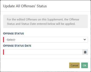 Click on the Update All Offense's Status hyperlink to update the offense status and status date on all edited offenses on the Supplement.