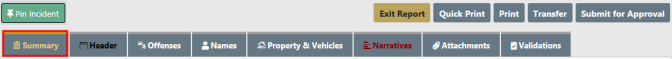 Information in the Summary tab is divided into sections, such as Officers, Employees, Offenders, Victims, Narratives, etc.