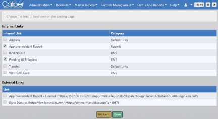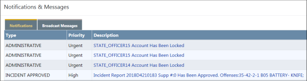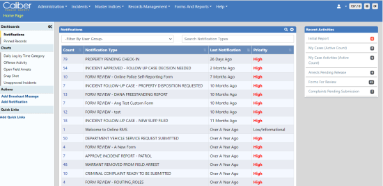 Online RMS is a comprehensive information management system. Access to Online RMS begins with the customizable Home page. This page can display any combination of recent activities, charts of crime statistics, links to the most frequently used functions in the system, external links to frequently referenced web sites and documents, broadcast messages from the command and control center or other officers in the field, outstanding reports that need approval or additional information, and various other items.