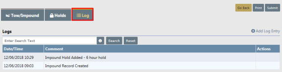 Data that contains the date, time, and a summary of what occurred such as, when the record was created in Online RMS, hold and release dates, etc. The data is generated by Online RMS automatically, and you have the ability to manually add a log entry.