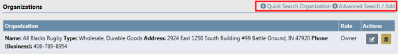 The Organizations section allows you to search the Master Organization Index and use existing records if already in system by clicking on the Quick Search Organization link, or you can, with proper permissions, add a new Master Organization Index record by clicking on the Advanced Search/Add link. For more information on Master Indices, refer to Master Indices.